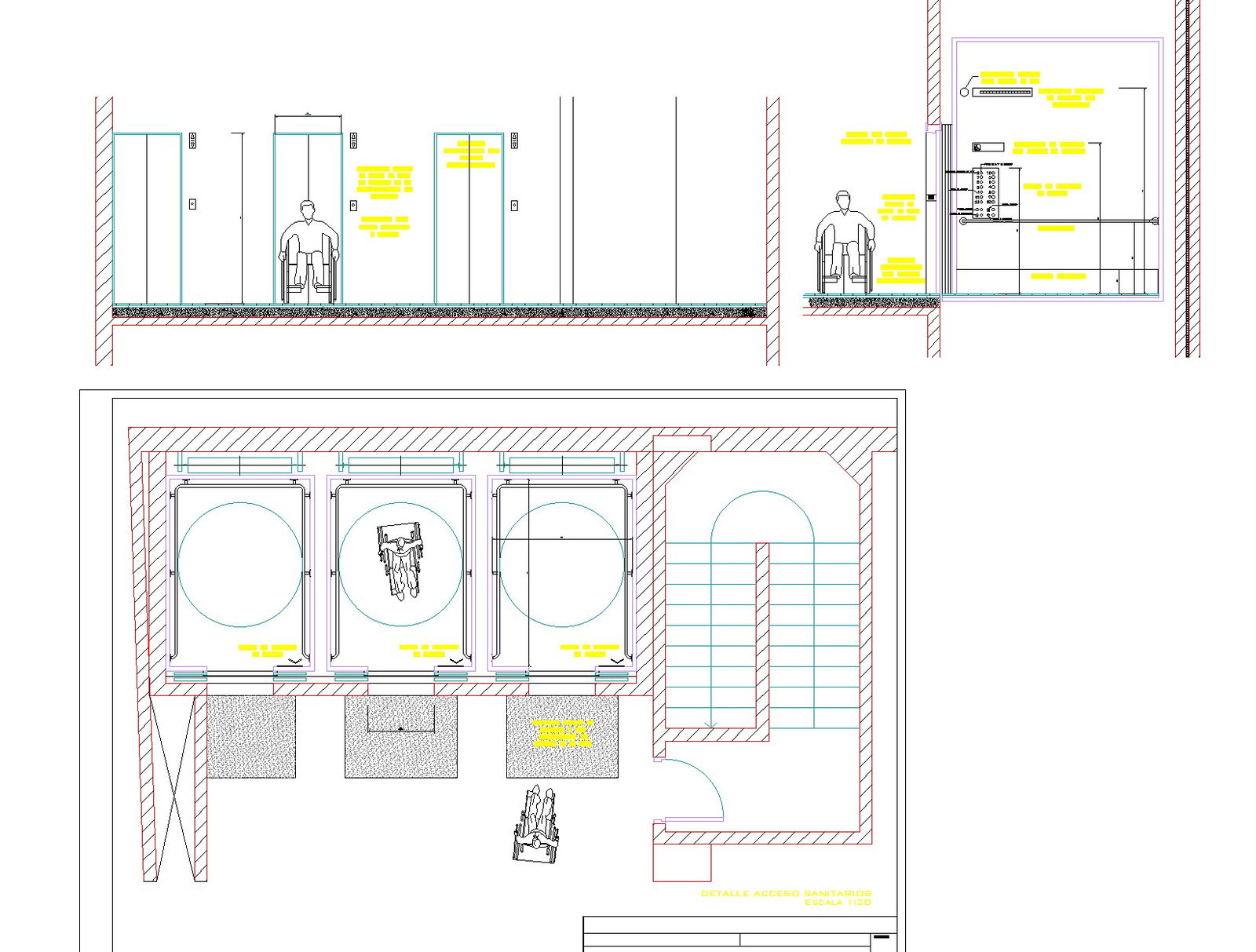 Accessible elevators plant section layout file, dimension detail, naming detail, stair detail, hatching detail, furniture detail in door and window detail, cut out detail, etc.
