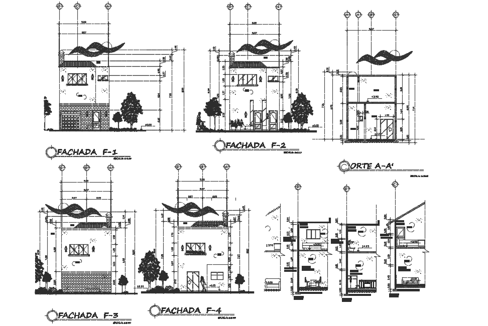 Different axis elevation and section view for residence building dwg file in elevation with view of