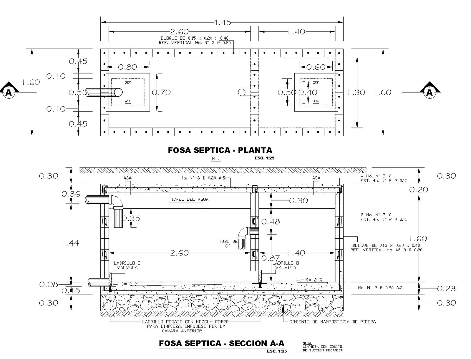 Septic grave plan and section autoacd file, section line detail, dimension detail, naming detail, pipe lien detail, scale 1:25 detail, stone detail, concrete mortar detail, etc.