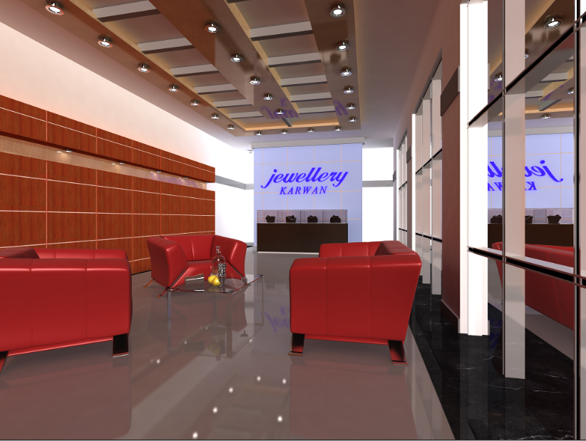 Jewelry shop interior design details that includes a detailed view of interior with lightning view, furniture view, seating area, name hoarding, ceiling interior and much more of jewelry shop design.