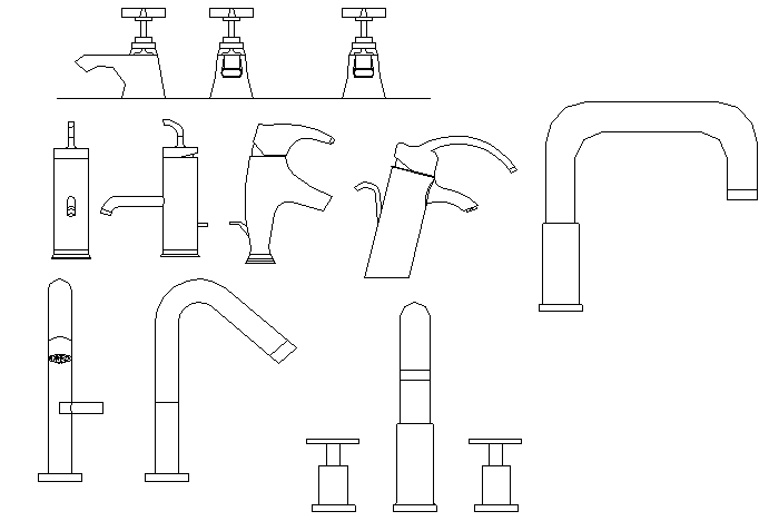 Multiple bathroom taps design block details that includes a detailed view of small tap, big tap, rounded tap etc for multi purpose uses for cad project.