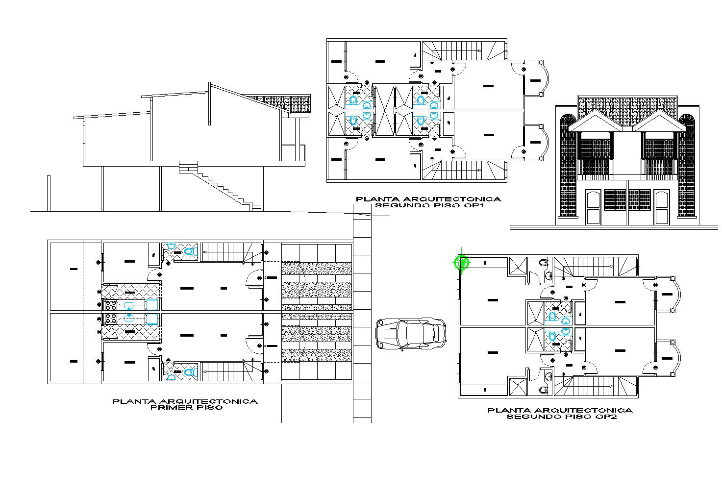 Grouped houses plan. The top view plan with front elevation and details. Detailing of WC, wash-basin, door, window, railings, staircase, etc.,