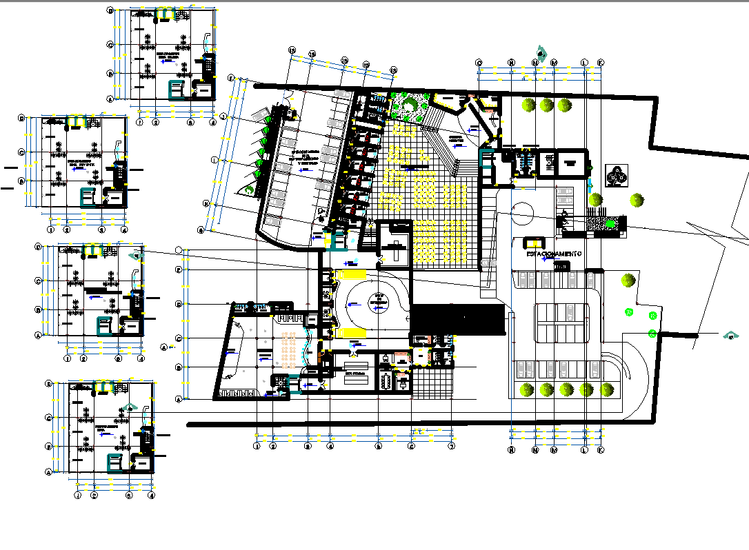 Mall cultural plan layout file, centre lien plan detail, dimension detail, naming detail, landscaping detail tree and plant detail, car parking detail, hatching detail, etc.