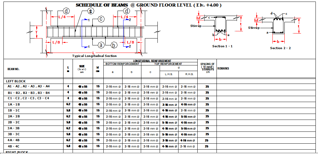 Schedule of beam at eight level of building that includes a detailed view of reinforcement details, slab thickness, beam sheet details, dimensions and much more of beam details.