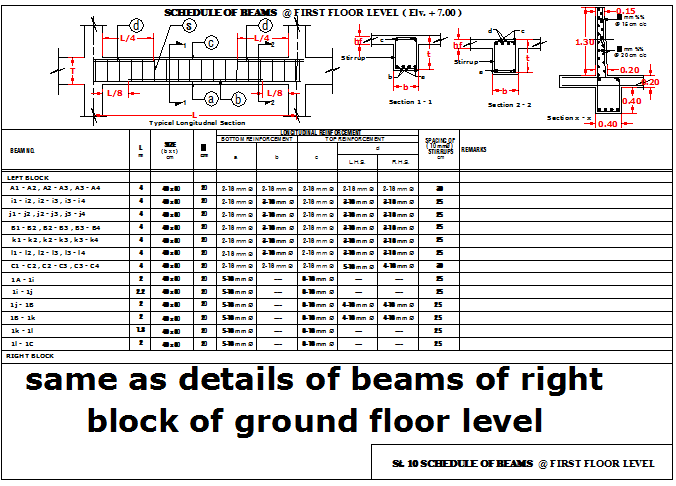 Detail of beams of right block of ground floor level that includes a detailed view of beam schedule, reinforcement details, slab thickness, beam sheet details, dimensions and much more of beam details.