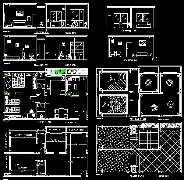 The house interior and DWG CAD design drawing file are provided. modern interior, floor plan, ceiling plan, & sections A, B, C & D of house interior design.
