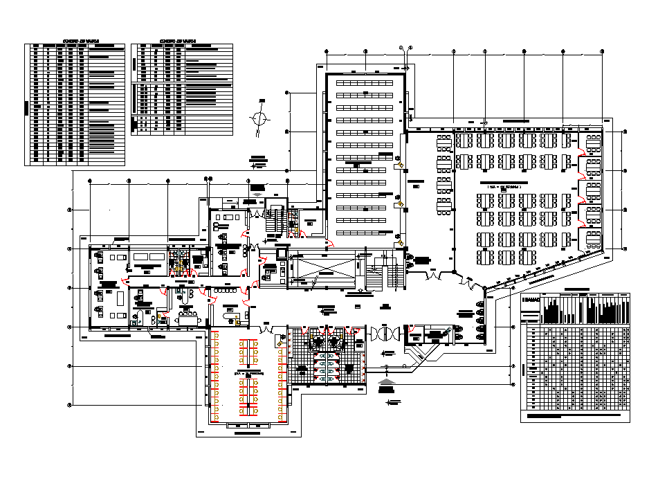 Planning Library plan autocad file, centre lien plan detail, dimension detail, naming detail, furniture detail in door, table, chair and window detail, north direction detail, toilet detail, specification detail, etc.