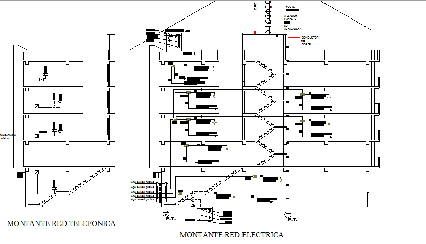 Front and side sectional details of corporate building that includes a detailed view of front section, back section, flooring view, staircase sectional view, doors and windows view, electric installation details and much more of building project.
