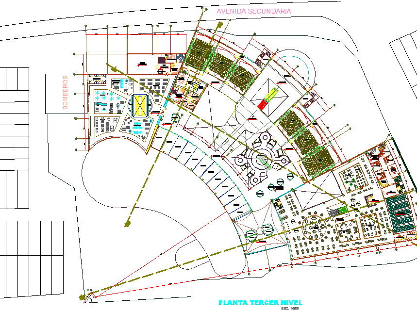 Shopping center plan layout file, centre line plan detail, dimension detail, cut out detail, naming detail, hidden line detail, scale 1:500 detail, etc.