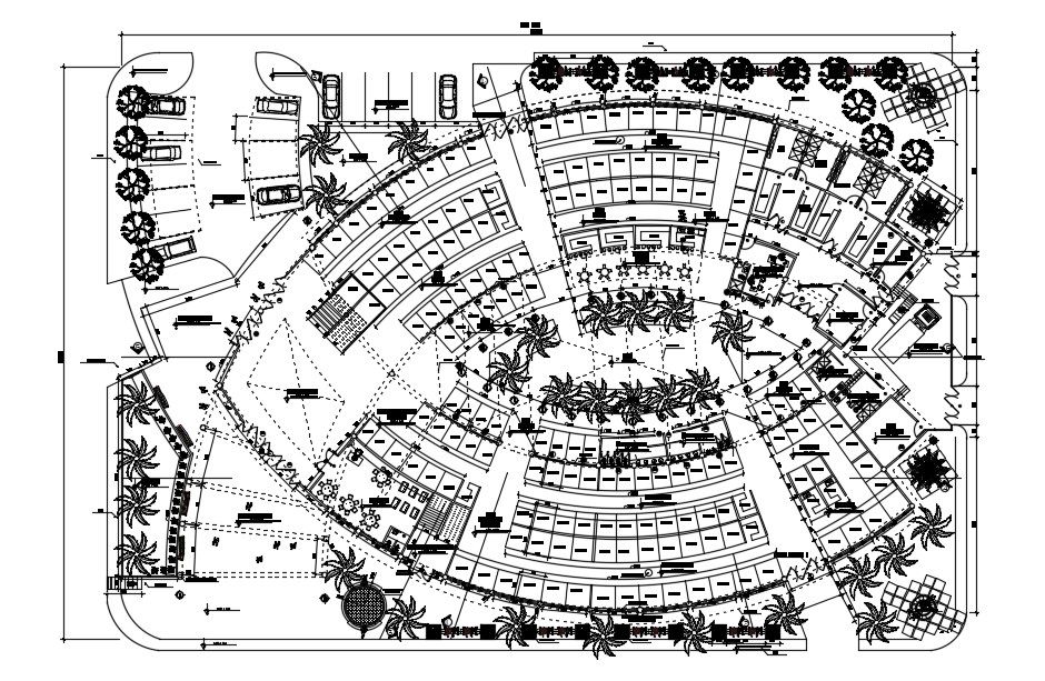 Food Market Plan which shows, landscaping detail in tree and plant detail, dimension detail, naming detail, section line detail, etc.
