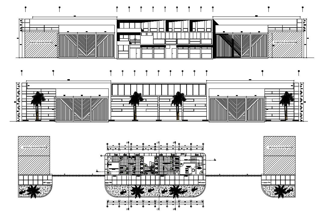 building elevation which shows section line detail, dimension detail, naming detail, front elevation, side elevation detail.