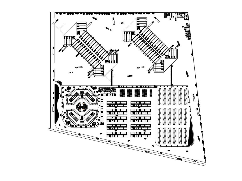 Food market plan dwg file, landscaping detail in tree and plant detail, dimension detail, naming detail, stair detail, car parking detail, etc.
