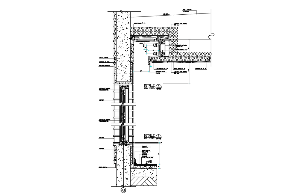 Concrete Wall Section which includes beam detail, wooden window, mineral wool insulation, etc.