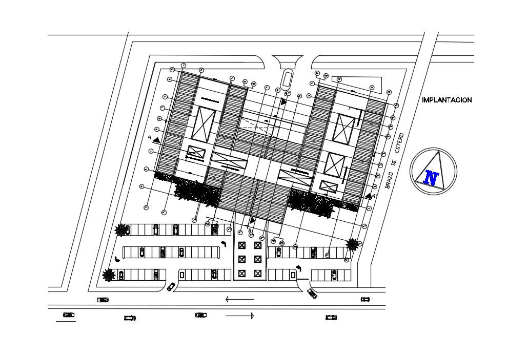 University Site Plan In AutoCAD File which includes north direction detail, parking area detail, centre lien plan detail, dimension detail, landscaping detail.