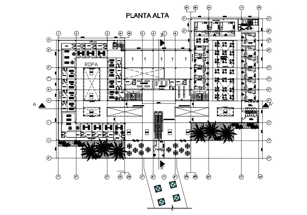 Showroom Floor Plan In AutoCAD File which includes Top floor details, service area, clothes area, projection room, man and women washroom, food counter, entry-exit gate, etc.
