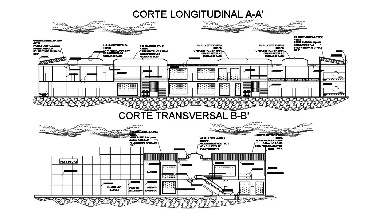 Clinic Plan Detail In AutoCAD File which includes section A-A’ detail, section B-B’ detail, metal cover, iron structure, beam plan, column detail, pharmacy doctor, hatching detail.