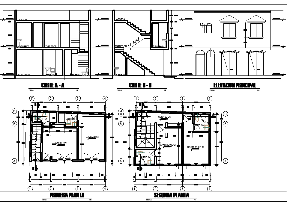 Commercial Plan In DWG File which includes Plan, elevation and section local commercial project , section A-A’ detail, section B-B’ detail, front elevation detail, first floor and second floor plan detail, stair detail, furniture detail, etc.