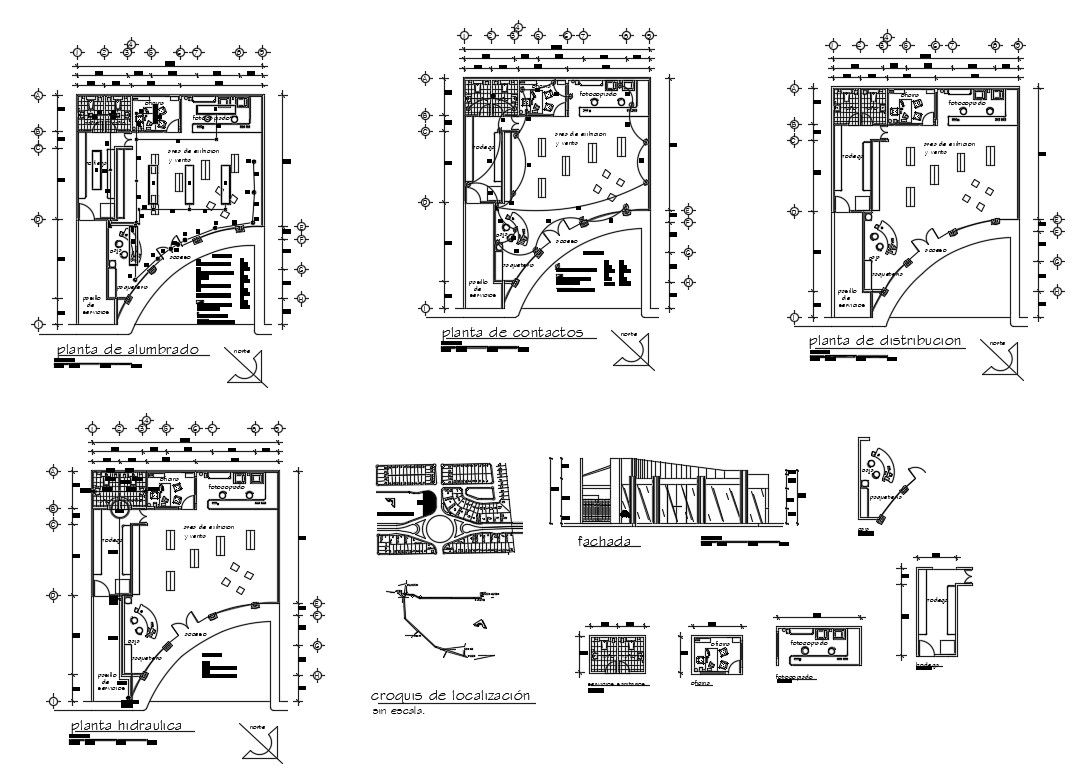 Office Floor Plan In DWG File which includes lighting plant, contact plant, Distribution plant, map detail, sanitary services area, office area,