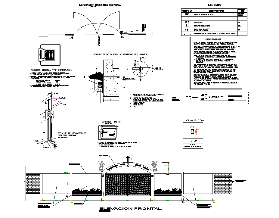 Entrance Gate Elevation In AutoCAD File which includes general board location detail, lighting security installation detail.