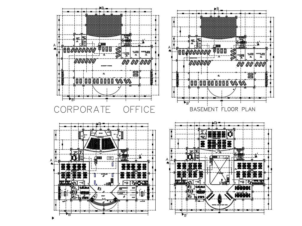 Corporate Office Plan In AutoCAD File which includes corporate office plan, basement floor plan, first and second-floor plan, basement parking details, workstation, electric room.