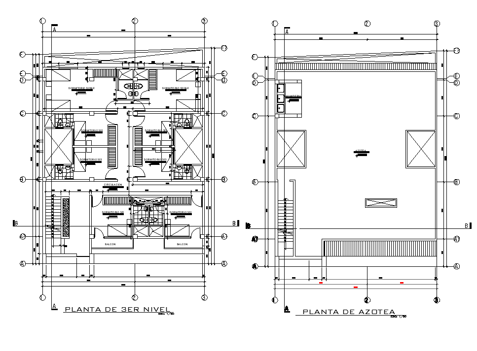 Home Floor Plans In AutoCAD File which includes two-bedroom, Porcelain tiles floor, rooftop details, balcony, etc.