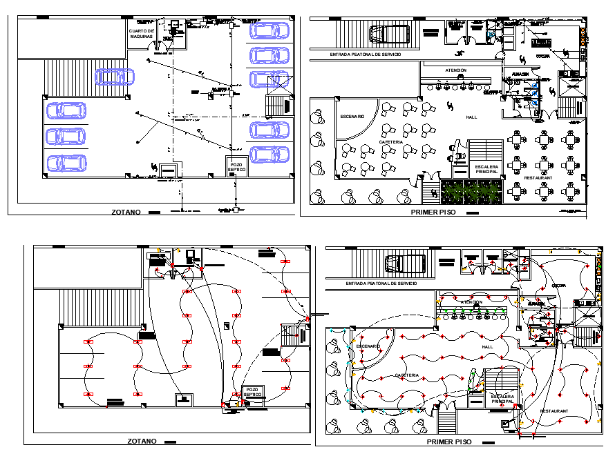 Download Free Cafe Plan AutoCAD Drawings which includes the details of cafe area, hall, parking area, entrance details, it also includes the wiring details.