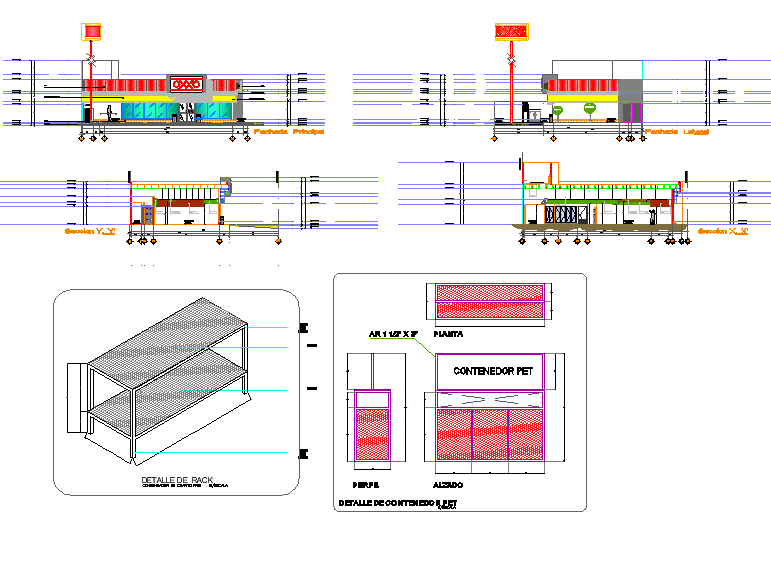 Shop Building Elevation CAD Drawings,floor level, wall, door and window view and view of wall and wall support view with detail of rack isometric view with necessary dimension.