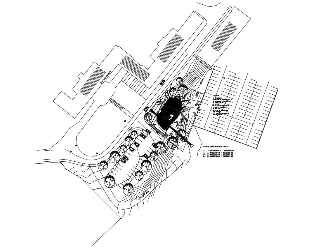 Landscape view of modern house dwg file in view with area distribution with modern house with road ,tree and garden area view in plan.