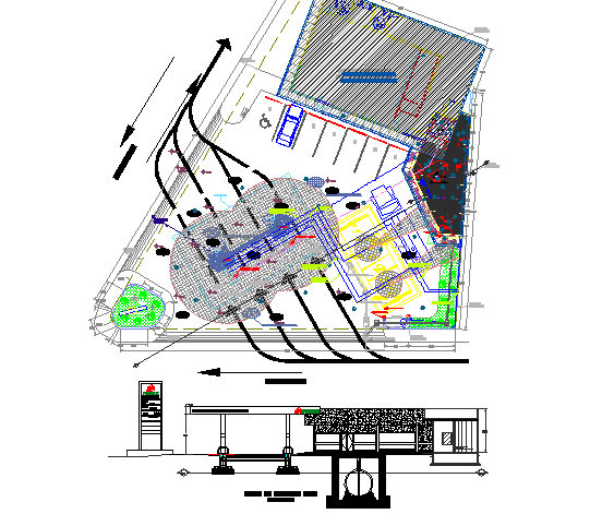 Landscaping and site plan details of gas station that includes a detailed view of outdoor roads, indoor roads, green area, tree view, landscaping view, parking view, landmarks, mini garden and much more of gas station landscaping.