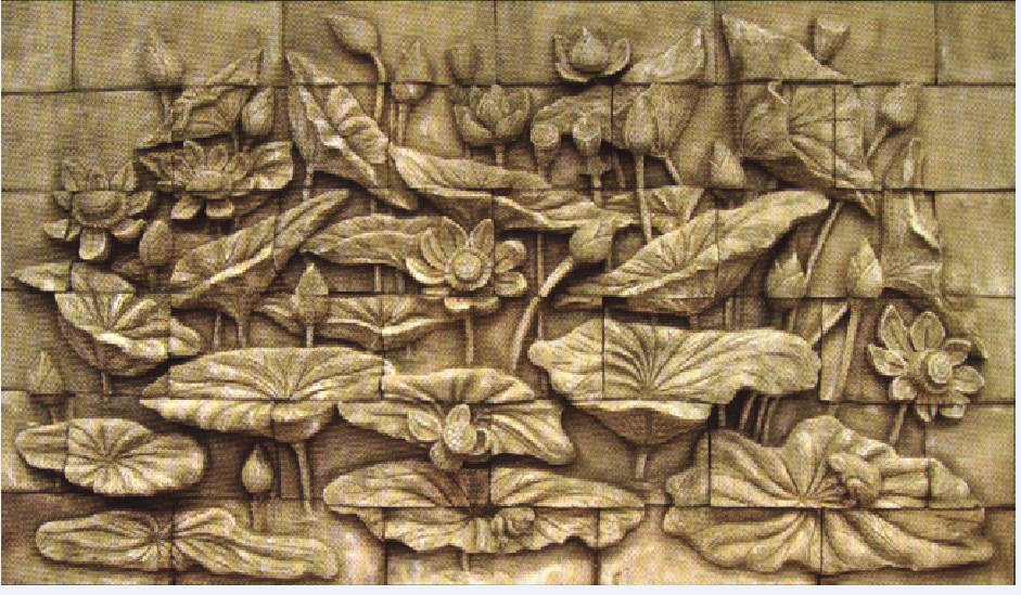 Living room interior design of wall of house that includes a detailed traditional type wall design using sculptures and tree design for living room wall of house.