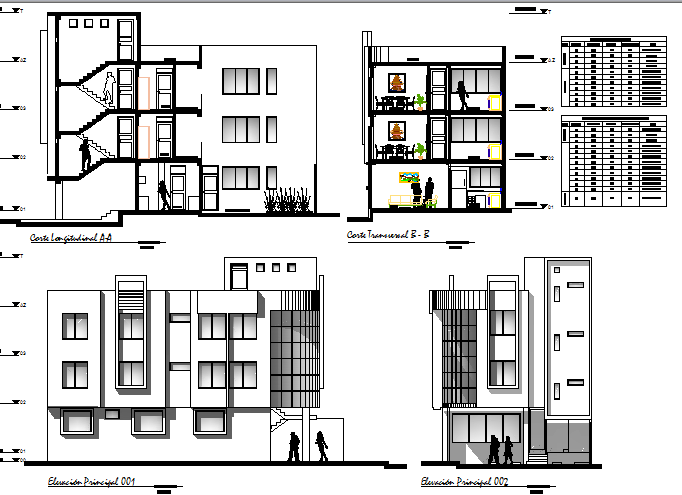 Multi -family dwelling housing building elevation and section that includes a detailed view of front and back elevations and sections, flooring view, doors and windows view, tree view, wall design, dimensions, wall sections, staircase view, terrace view, living room and much more of house building.