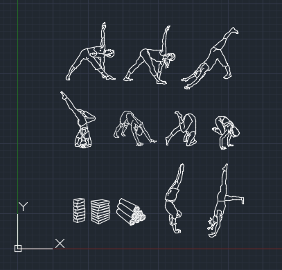 8 people doing diverse yoga poses, plus blocks and mats. The characters are suitable for axonometric drawings
