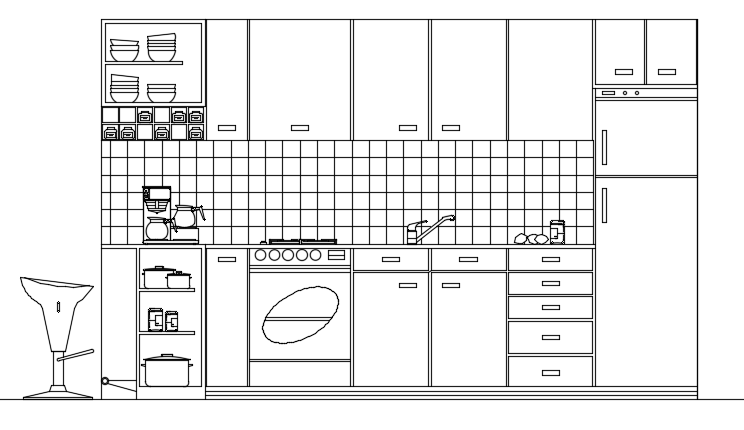 Kitchen front elevation details, front kitchen platform and cabinet details are shown , crockery details etc in auto cad format