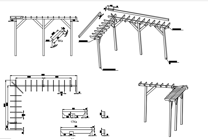 Pergola design details dwg file, sectional details of a pergola , front view and top view details in auto cad format