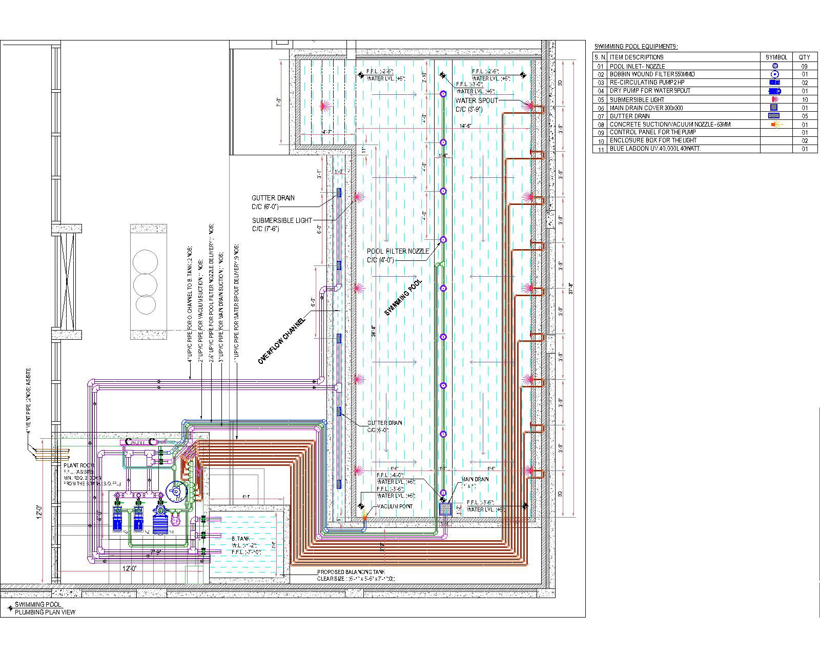 this is autocad paln & section of swimming pool,plant room,& balancing tank with plumbing & equipment details along with its drainage system.