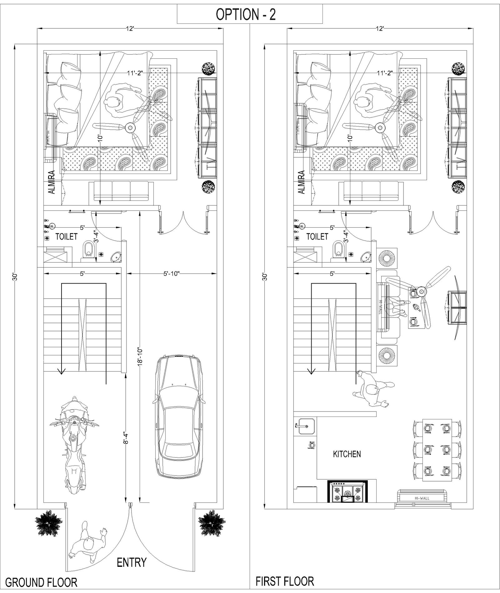 i create a 12x30 floor plan with one bedroom or some drawing room space. & some space for parking also.