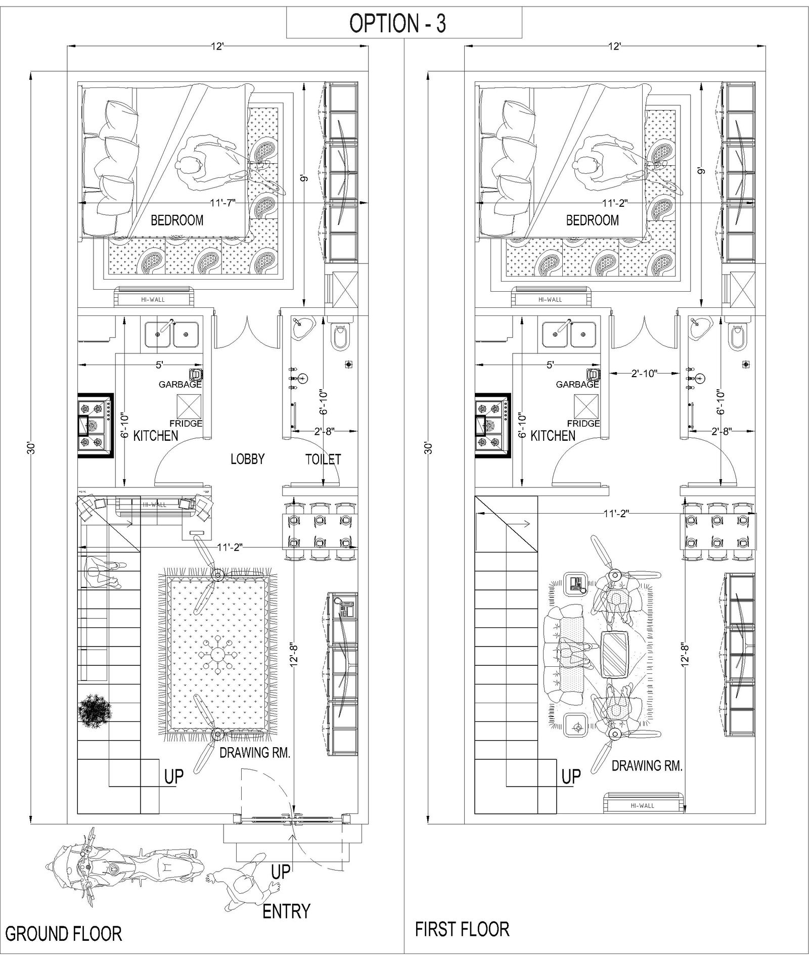 i create a 12x30 floor plan with one bedroom or some drawing room space. & some space for parking also.
