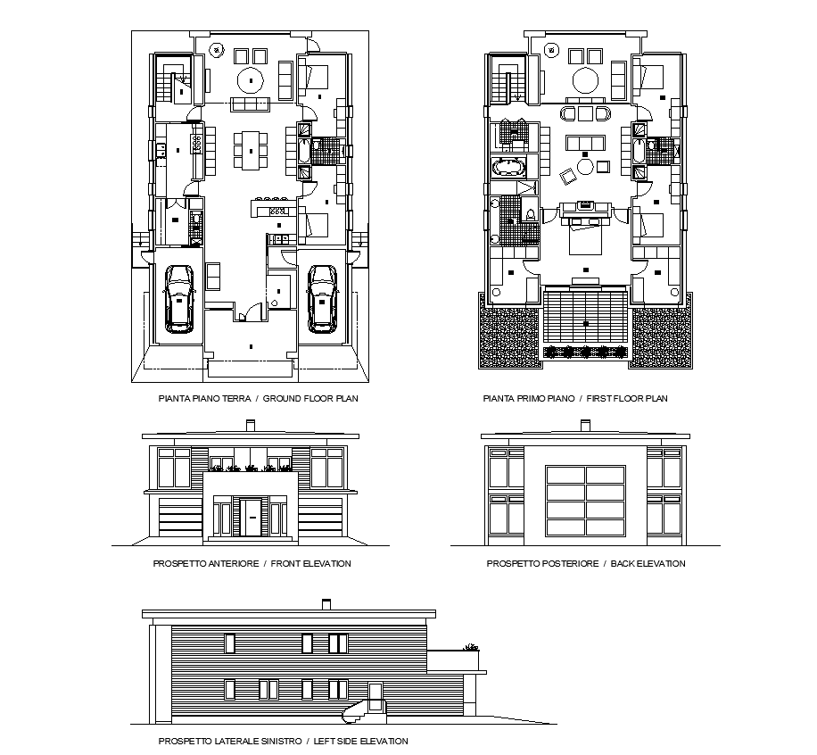 Residential housing structure 2d view elevation and plan layout dwg file, floor level detail, furniture detail, plan view detail, parking detail, vechicle detail, door and window detail, staircase detail, landscaping detail, front elevation detail, back elevation detail, side elevation detail, toilet and bathroom detail, etc.