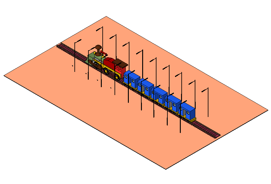 Toy train detail elevation 3d model sketch-up file, isometric view detail, cabins detail, engine detail, lamp post detail, track detail, coloring detail, sleepers detail, wheels detail, horn detail, nut bolt detail, door and window detail, etc.