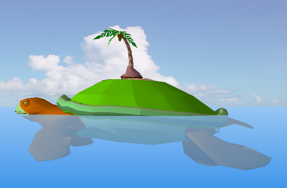 Turtle shape island detail elevation 3d model sketch-up file, side elevation detail, water detail, coloring detail, landscaping trees and sky detail, perspective view detail, legs detail, eyes detail, tail detail, etc.