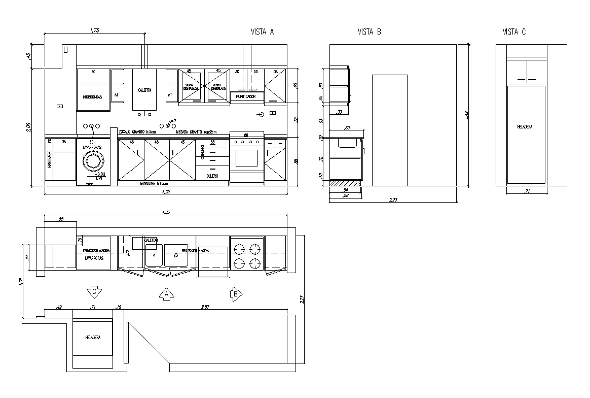 Detail of kitchen furniture 2d view layout dwg file, front elevation detail, cabinet detail, rack detail, drawer detail, dimension detail, washing machine detail, platform detail, wash-basin detail, door detail, wall detail, top elevation detail, side elevation detail, gas stove detail, hidden line detail, dimension detail, etc.