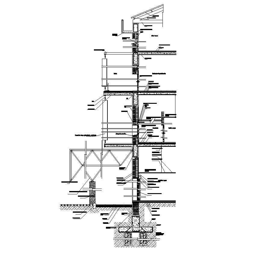 Wall structural sectional elevation 2d view layout file, cut out detail, reinforcement detail in tension and compression zone, floor level detail, slab detail, roof detail, naming detail, dimension detail, cover detail, footing detail, main and distribution bar detail, concrete masonry detail, floor detail, stirrups detail, etc.