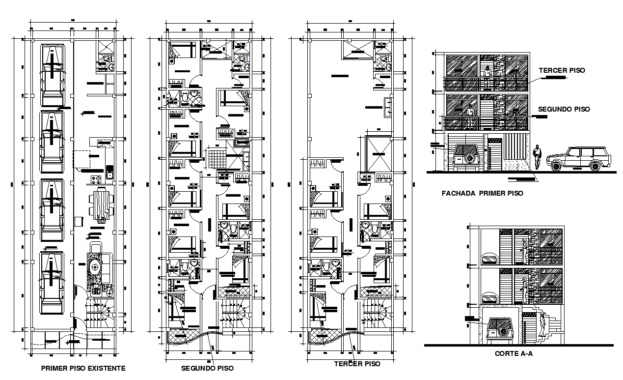 Lodging building 2d view layout plan, plan view detail, furniture detail, floor level detail, wall detail, flooring detail, bed and table detail, sanitary toilet and bathroom detail, hatching detail, door and window detail, dimension detail, parking space detail, vechicle detail, hidden line detail, front elevation detail, section A-A detail, etc.
