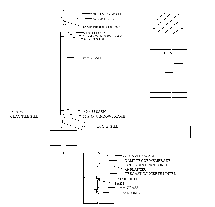 Window sill detail structure 2d view layout file, glass structure detail, dimension detail, naming detail, cavity wall detail, weep hole detail, window frame detail, lintel detail, clay tile sill detail, cut out detail, damp proof membrane detail, plasterwork detail, etc.