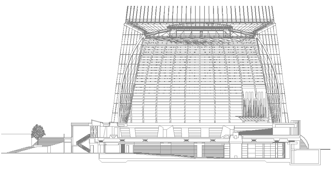 Commercial building detail elevation 2d view layout file, front elevation detail, staircase detail, door and window detail, riser and thread detail, wall detail, glass structure detail, hatching detail, landscaping trees detail, railing detail, etc.