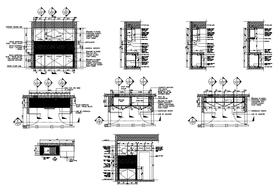 Detail kitchen building structure 2d view layout autocad file, furniture detail, wall detail, dimension detail, door detail, section line detail, cut out detail, flooring detail, shelves and cabinet detail, numbering detail, gas pipe detail, plan view detail, platform detail, side elevation detail, tiles detail, sink detail, etc.