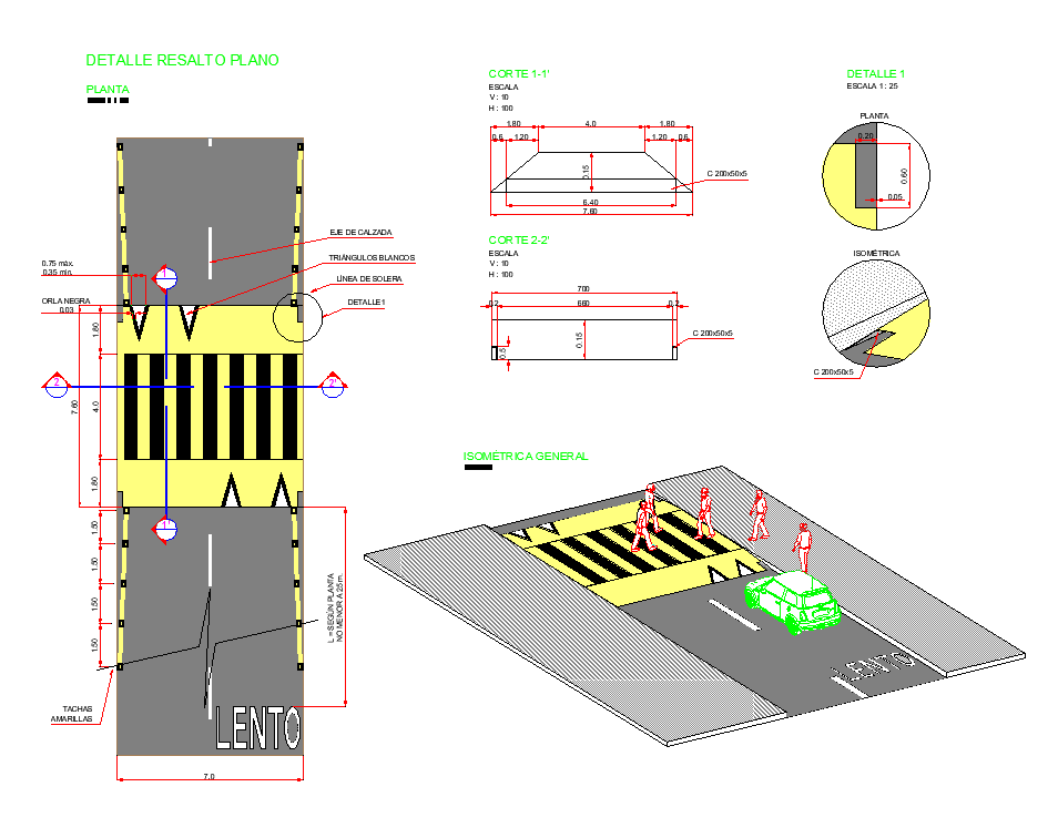 Detail road pavement structural elevation layout file, top elevation detail, carriage way detail, embankment detail, zebra crossing detail, shoulder width detail, dimension detail, section line detail, isometric view detail, scale 1:25 detail, section 2-2'detail, plan view detail, vechicle and people detail, slope V:H 10:100 detail, etc.