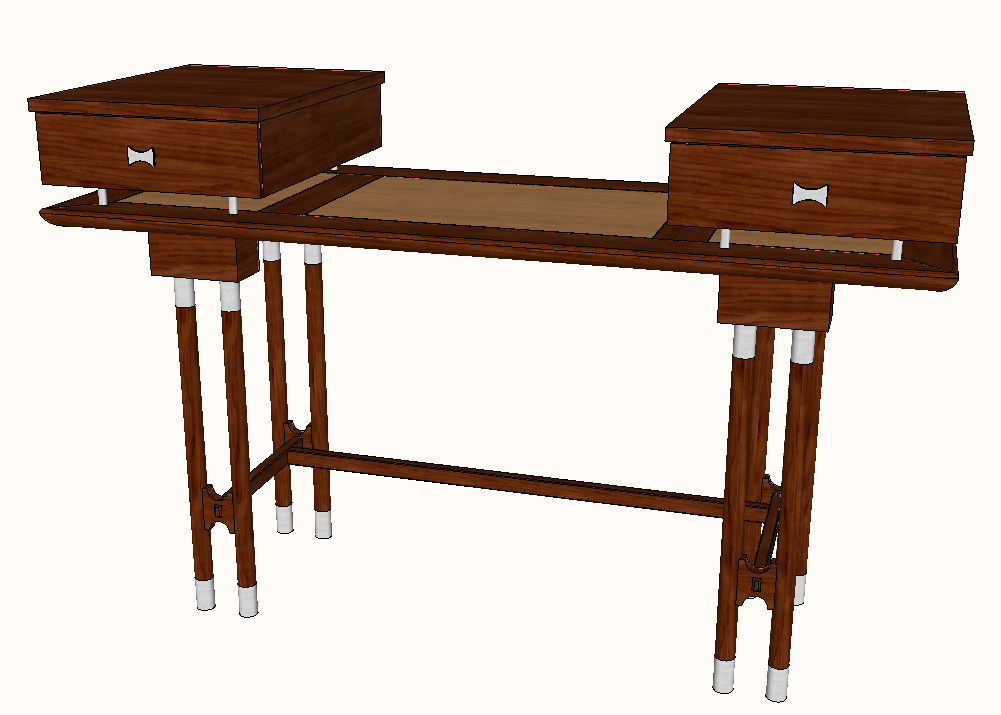 Writing desk detail elevation 3d model sketch-up file, isometric view detail, leg support detail, wooden structure detail, struts detail, coloring detail, drawer detail, nut bolt detail, etc.