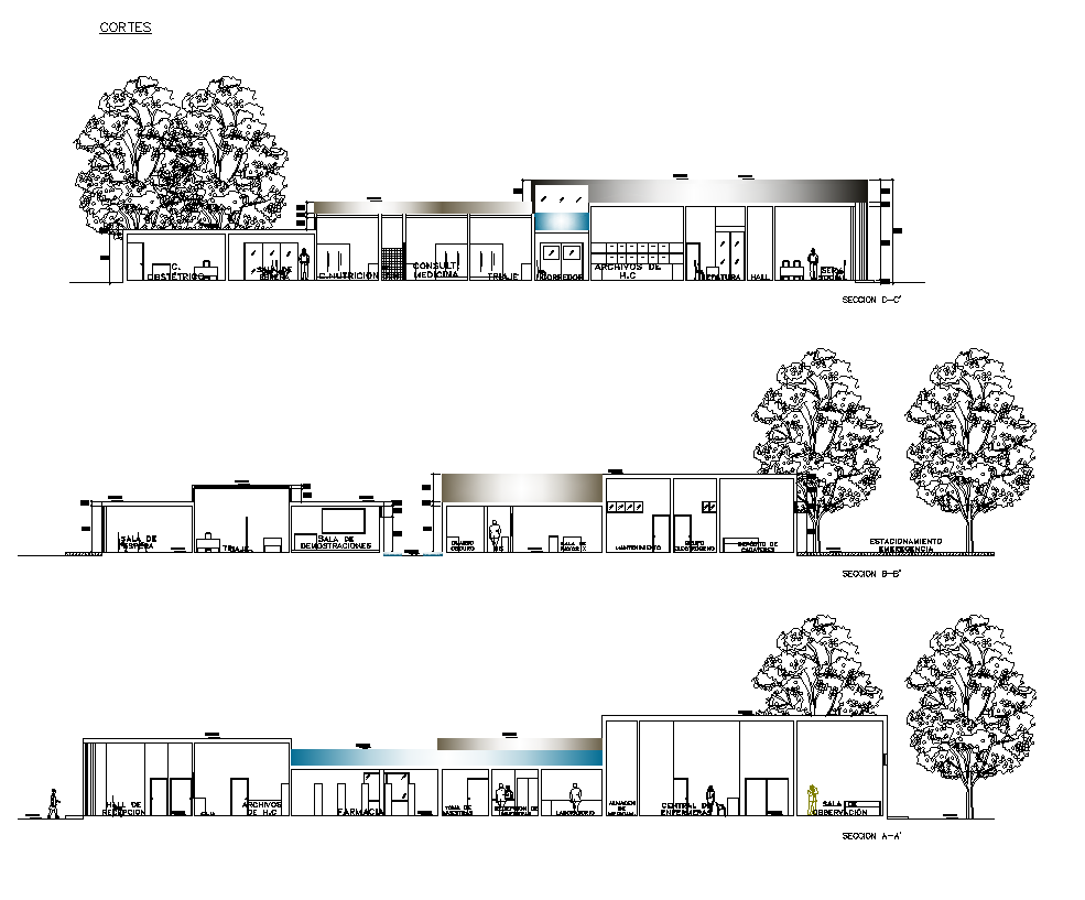 Hotels building structure sectional elevation 2d view layout file, door and window detail, wall detail, flooring detail, floor level detail, section A-A'detail, reception hall detail, section B-B' detail, landscaping trees detail, section C-C'detail, hatching detail, furniture detail, people detail, etc.