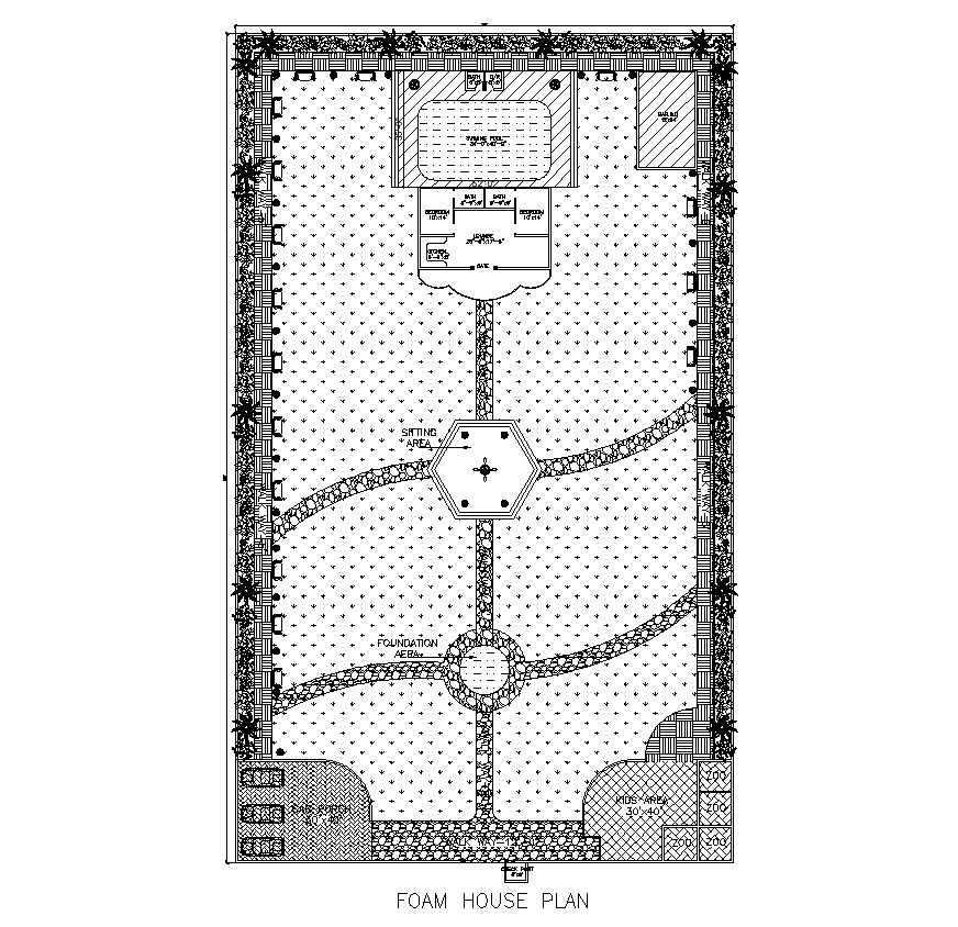 Farmhouse building plan detail 2d view layout autocad file, wall detail, flooring detail, door and window detail, hatching detail, sitting area detail, bedroom detail, swimming pool detail, living room detail, sanitary toilet and bathroom detail, landscaping plants detail, parking space detail, vehicle detail, kids area and garden detail, room dimension detail, kitchen detail, etc.